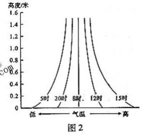 4.图2为北半球中纬度某地某日5次观测到的近地面气温垂直分布示意图。当日天气晴朗,日出时间为5时。读图回答3-4题。