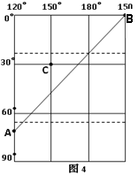 10.图4为经纬网图。图中A点位于南纬68度,AB为晨昏线的一段;此刻,北京处于白昼;近期,C地日出时刻越来越早。据题设条件回答10-11题。