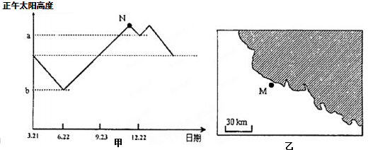 下图中图甲为图乙(阴影部分为海洋)中M地一年内正午太阳高度的变化规律,已知a-b=38.5º,且M地3月21日4:15(北京时间)日出