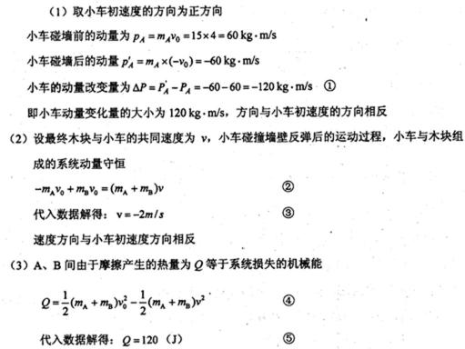 (2)质量为M的小车左端放有质量为m的铁块且M>m,以共同速度v0沿光滑水平面向竖直墙运动,车与墙碰撞的时间极短,不计动能损失。铁块与小车之间的动摩擦因数