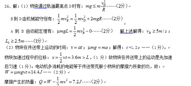 24.如图所示的装置,其中AB部分为一水平传送带,并以v = 6m/s速度顺时针匀速转动;BCD部分为一半径R=0.5m,竖直放置的光滑半圆形轨道,直径BD恰好竖直,并与传送带相切于B点。现将一质量为0.4kg的可视为质点的小滑块无初速地放在传送带的左端A点上,已知滑块与传送带间的动摩擦因数μ=0.5。(g=10m/s2)。