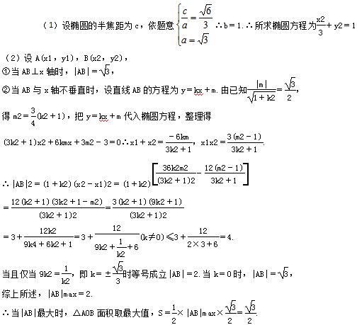 (2)设直线l与椭圆C交于A、B两点,坐标原点O到直线l的距离为,求△AOB面积的最大值。
