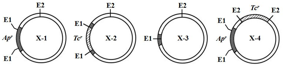 下图四种质粒含有E1和E2两种限制酶的识别位点,Apr表示抗青霉素的抗性基因,Tcr表示抗四环素的抗性基因。