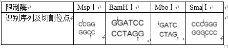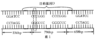 上图中,结构甲的建构可用下图1和2表示。图1表示含有目的基因的DNA片段长度(bp即碱基对)和部分碱基序列,图2表示一种质粒的结构和部分碱基序列。现有4种限制性核酸内切酶,它们识别的碱基序列和酶切位点分别为下表所示。