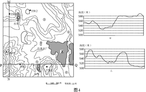 8.图4是某地地形图,MN、PQ是地形剖面线。①、②是水库,若从中选择一个作为自来水厂的水源地,其条件是自流引水且工程建设费用最小。