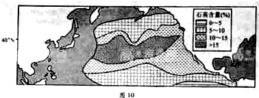 31.石英是一种稳定物质,广泛存在于岩石.沙头中,深海沉积物中的石英短时期内不会自生自灭。图10北太平洋沉积物种中石英行量分布。北太平洋沉积物中的石英主要源自( )