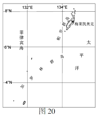 帕劳是美丽的西太平洋岛国,位于太平洋板块与菲律宾板块交界处,由一个大堡礁和许多小岛礁构成。图20是帕劳的地理位置图。读图回答下列问题。