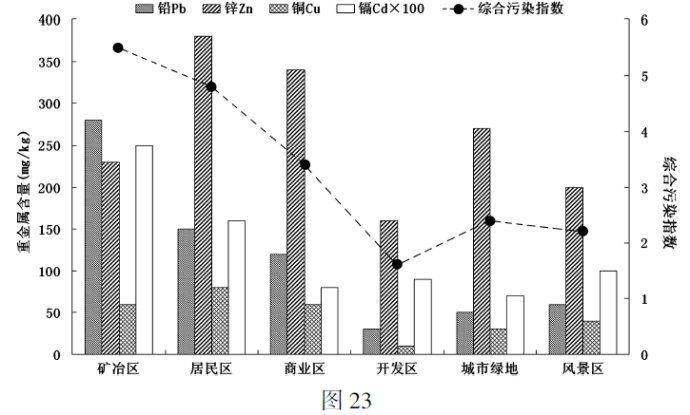 我国首次全国土壤污染状况调查表明:我国部分地区土壤污染较重,镉、铅3种重金属污染物含量呈现从西北到东南、从东北到西南方向逐渐升高的态势。图23为甲城市不同功能区土壤中4种重金属元素含量及用此4种元素计算出的综合污染指数。读图回答下列问题。