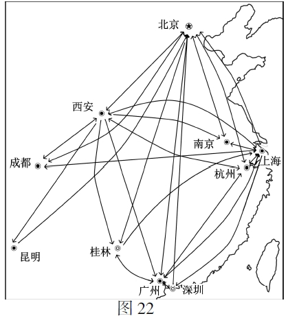 图22是中国部分重点旅游城市欧美入境旅游联系图,箭头指向表示境外客在某城市旅游后的流向。读图回答下列问题。