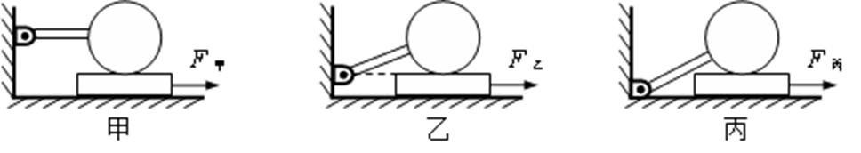 16.有三个完全相同的重球,在每个球和水平面间各压了一块相同的木板,并都与一根硬棒相连,棒的另一端分别与一铰链相连,三个铰链的位置如图甲、乙、丙所示。现分别用力F甲、F乙、F丙将木板水平向右匀速抽出,(水平面光滑,重球和木板是粗糙的)。则下列关于F甲、F乙、F丙大小关系判断正确的是[来