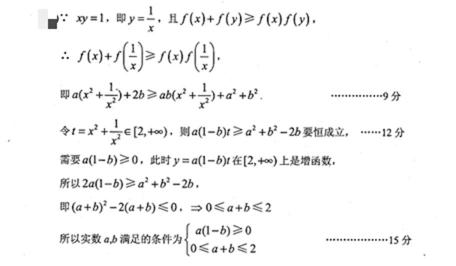21.求实数a,b满足的条件,使得对任意满足xy=l的实数x,y,都有f(x)+f(y))≥f(x)f(y))成