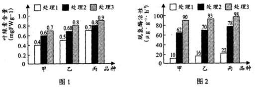 ①从甲、乙、丙三个品种中挑选具有2-4片叶、长势相同的玉米幼苗,平均分成三组,分别放在低温5℃(处理1)、10℃(处理2)及常温25℃(处理3)的环境中培养4天。