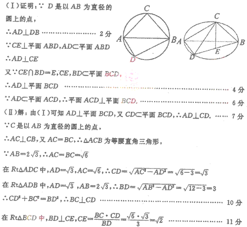 ∵BD∩CE=E,∴AD⊥平面BCE。
