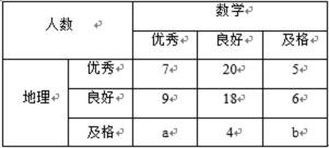 成绩分为优秀、良好、及格三个等级,横向、纵向分别表示地理成绩与数学成绩,例如:表中数学成绩为良好的共有20+18+4=42人。