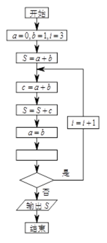 某同学想求斐波那契数列0,1,1,2,…(从第三项起每一项等于前两项的和)的前10项的和,他设计了一个程序框图,那么在空白矩形框和判断框内应分别填入的语句是