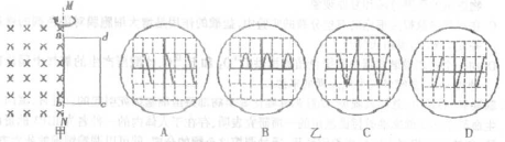 19.如图甲所示的空间存在一勻强磁场,其方向为垂直于纸面向里,磁场的右边界为MN,MN在 —右侧有一矩形金属线圈abcd ,ab边与MN重合.现使线圈以ab边为轴按图示方向匀速 转动(从上往下看为顺时针转动),将a,b两端连到示波器的输入端,若ab边中电流从a到 b为正,则从图乙中示波器观察到的ab中电流随时间变化的图形是()