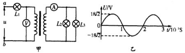 如图甲所示电路中,L1、L2、L3为三只“6V 3W”的灯泡,变压器为理想变压器,各电表均为理想电表,当ab端接如图乙所示的交变电压时,三只灯泡均正常发光。下列说法中正确的是