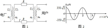 图1,某电厂要将电能输送到较远的用户,输送的总功率为9.8×104W,电厂的输出电压按如图2所示规律变化,为减少输送功率损失,先用一理想升压变压器将电压升高再输出,已知升压变压器原副线圈匝数比为