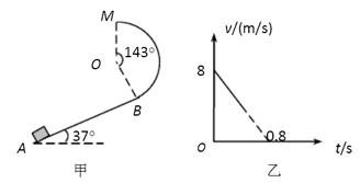 24.如图甲所示,一半径R=1m、圆心角等于143°的竖直圆弧形光滑轨道,与斜面相切于B处,圆弧轨道的最高点为M,斜面倾角θ=37°,t=0时刻有一物块从斜面底端A处沿斜面上滑,其在斜面上运动的速度变化规律如图乙所示.若物块恰能到达M点,(取g=10m/s2,sin37°=0.6,cos37°=0.8),求: