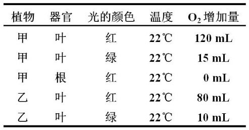 将等量甲、乙两种植物的不同器官在不同颜色的光下照8小时,测得的数据见表。据表分析,决定光合作用是否发生的因素是