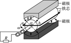 某兴趣小组设计了一种发电装置,如图所示,在磁极和圆柱状铁芯之间形成的两磁场区域的圆心角α均为