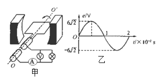 17.如右图所示,甲为一台小型发电机构造示意图,线圈逆时针转动,产生的电动势随时间变化的正弦规律如图乙所示。发电机线圈内阻为1 Ω,外接灯泡的电阻为9 Ω恒定不变,则下列说法中正确的为 ( )