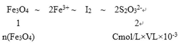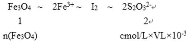 Fe3O4样品,溶于稀盐酸,Fe3O4 + 8H+ == Fe2+ +2 Fe3+ +4H2O 溶液中含有Fe3+离子,具有氧化性,过量的KI则 2 Fe3+ +2 I‾ == 2Fe2+ + I2 ,反应后滴入几滴淀粉溶液,溶液呈蓝色。后用 Na2S2O3溶液滴定,其原理为已知:I2+2S2O32-═2I-+S4O62- ,滴定的终点即I2消耗完,其变化为溶液由蓝色变无色,且半分钟不变色,利用关系式法