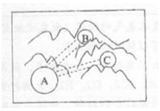 右图表示某种两栖动物3个种群在某山脉的分布。在夏季,种群A与B、种群A与C的成员间可以通过山脉迁移,有人研究了1900年至2000年间3个种群的变化过程。资料显示1915年在种群A和B的栖息地之间建了矿,1920年在种群A和C的栖息地之间修了路。100年来气温逐渐升高,降雨逐渐减少。