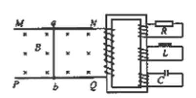 20、如图所示,MN和PQ为两个光滑的电阻不计的水平金属导轨,变压器为理想变压器,今在水平导轨部分加一竖直向上的匀强磁场,则以下说法正确的是 ( )