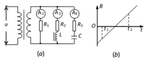 图(a)所示电路中,A1、A2、A3为相同的电流表,C为电容器,电阻R1、R2、R3的阻值相同,线圈L的电阻不计。在某段时间内理想变压器原线圈内磁场的变化如图(b)所示,则在t1~t2时间内( )