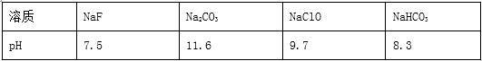 相同浓度的钠盐溶液碱性越强,说明酸根离子水解程度越大,则相应酸的酸性越弱,酸的电离平衡常数越小,根据钠盐溶液的pH知,酸根离子水解程度CO32ˉ >ClO->F-,酸的电离平衡常数从小到大顺序是:HCO3ˉ<HClO<HF