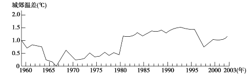 1.读“1960~2003年北京城郊温差变化曲线”图,根据城郊温差变化曲线可知,北京热岛效应强度( )