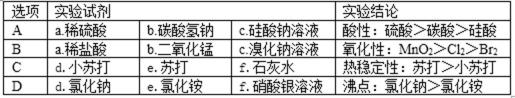 :A..强酸能弱酸盐反应生成弱酸,根据强酸制取弱酸判断酸性强弱,稀硫酸和碳酸氢钠反应生成二氧化碳,二氧化碳、水和硅酸钠反应生成难溶性硅酸,看到的现象是烧瓶中有气体生成、c中有沉淀生成,所以可以实现实验目的,故A正确;B.稀盐酸和二氧化锰不反应,浓盐酸和二氧化锰在加热条件下反应生成氯气,所以不能得到氯气,不能实现实验目的,故B错误;C.碳酸钠热稳定性较强,碳酸氢钠不稳定,受热易分解,所以d为碳酸钠、e为碳酸氢钠,故C错误;D.氯化铵不稳定受热易分解,所以该装置不能实现实验目的,故D错误;