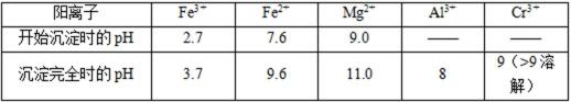 已知:①+3价Cr在酸性溶液中性质稳定,当pH>9时以CrO形式存在且易氧化;②常温下,部分阳离子以氢氧化物形式沉淀时溶液的pH如下。