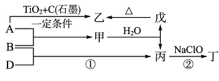 (4)一定条件下,A与TiO2、C(石墨)反应只生成乙和碳化钛(TiC),二者均为某些高温结构陶瓷的主要成分。已知,该反应生成1mol乙时放出536 kJ热量,其热化学方程式为:( )。