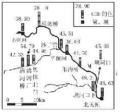 M 河为海河的支流,经多次修整已成“人工河”,其自净能力几乎为零,水质极差;因闸、坝多而使干流在枯水期流动性极差,几乎成湖泊。为改善水质,M 河在三个河段修建了污水处理厂。下图为M河干支流2009年至2010年的COD(化学耗氧量)观测数据,COD 数值越高,则水质越差。指出图中建有污水处理厂的三个河段。为了改善W 河水质应采取哪些措施?