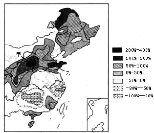 下图为2013 年7月我国东部地区降水距平百分率图(图中距平是指该时段降水量与该地区同期多年平均值的偏差)。读图,回答问题。