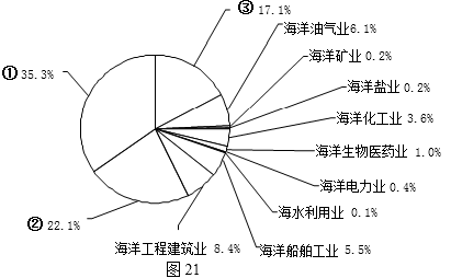 海洋是资源的宝库。科学合理利用和开发海洋,将会使地球上的人们生活得更富有、更美好。图21为2014年中国主要海洋产业增加值构成图,图22为1999~2014年河北昌黎文昌鱼栖息密度及生物量变化趋势图,表3为2014年我国部分重点岸段海岸侵蚀监测结果统计表。读图表回答下列问题。