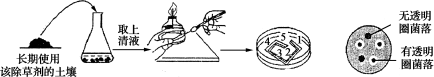 农业生产上有一种广泛使用的除草剂在土壤中不易被降解,长期使用会污染土壤。为修复被污染的土壤,可按图示程序选育出能降解该除草剂的细菌。已知该除草剂(含氮有机物)在水中溶解度低,含一定量该除草剂的培养基不透明。