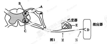47.在一次抗灾抢险行动中,救援队在雨中连续工作了6、7个小时,粒米未进,精疲力竭。突然,一名志愿者脚掌不慎被一枚长钉扎入,猛然抬脚,低沉叫一声“哎呀!”。然后医生为他做了紧急处理。图1为人某反射弧结构示意图,A、E、M、N为反射弧上位点,D为神经与肌细胞接头部位,是一种与B、C类似的突触。请据图作答。