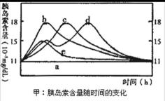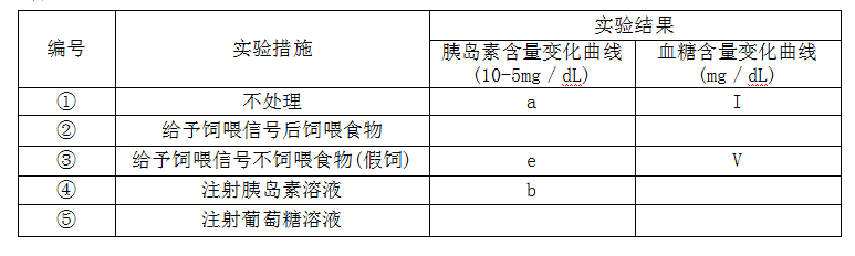 30.为了探究神经系统对胰岛素分泌的影响以及胰岛素含量与血糖含量变化的相互关系,选取健康、体征相同以及对饲喂信号(铃声)反应一致的空腹实验狗,分组编号后,按下表中实验措施进行实验。甲、乙两图表示不同实验条件下的胰岛素含量和血糖含量随时间变化曲线。请分析回答: