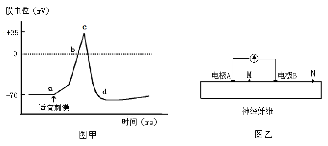 图甲表示置于生理盐水中的离体神经纤维,受刺激前后膜两侧电位变化情况,图乙表示用电流计测定神经纤维膜外电位差的装置。回答下列问题: