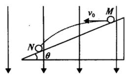 4.如下图所示,空间存在匀强电场,方向竖直向下,从绝缘斜面上的M点沿水平方向抛出一带电小球,最后小球落在斜面上的N点.已知小球的质量为m、初速度大小为v0、斜面倾角为θ,电场强度大小未知.则下列说法中正确的是( )