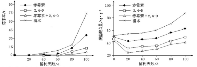 留树保鲜是通过延迟采收保持果实品质的一项技术。喷施赤霉素和2,4-D对留树保鲜柑橘的坐果率和果实内源脱落酸含量的影响如图所示。下列有关分析不正确的是