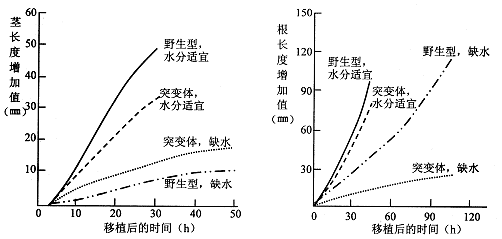 研究者以脱落酸水平正常的野生型玉米幼苗和脱落酸缺陷型突变体玉米幼苗为材料,测量玉米茎和根在不同水分条件下的生长情况,结果如下图所示。请分析回答: