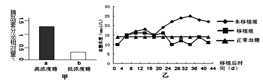 (2)体内移植实验:将细胞移植到患糖尿病的小鼠体内,测小鼠血糖,结果如图乙所示。胰岛素移植实验是否支持胰岛素释放实验的结论? ( ) 。实验还发现1-2只移植组小鼠的血糖浓度没有下降,可能的原因是 ( ) 。