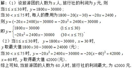 19.某旅行社为了在上海世博会期间,组团观看上海世博会,特设计一个组团包飞机去上海旅游,其中旅行社的包机费为30000元,旅游团中的每个人的费用按以下方式计算:若旅游团的人数在30人或30人以下,每人收费1800元;若旅游团的人数多于30人,则给以优惠,每多一人,每人(包括原来的30人)减少20元,但旅游团的人数最多只能有75人.