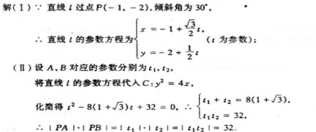 已知曲线C:y2= 4x,直线l过点P(-1,-2),倾斜角为30o,直线l与曲线C相交于A、B两点。