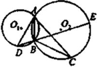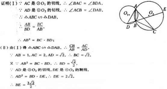 如图,⊙O1与⊙O2相交于点A,B,⊙O1的切线AC交⊙O2于另一点C,⊙O2的切线AD交⊙O1于另一点D,DB的延长线交⊙O2于点E。
