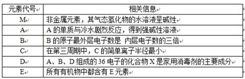 M属于非金属元素,其气态氢化物的水溶液呈碱性,可知M元素是N元素。短周期主族元素,A的单质能与冷水剧烈反应,得到强碱性溶液,则A为钠元素;B的原子最外层电子数是其内层电子数的三倍,B有2个电子层,最外层电子数为6,故B为氧元素;在第3周期元素中,C的简单离子半径最小,C为铝元素;A、B、D组成的36电子的化合物X是家用消毒剂的主要成分,X为NaClO,D为Cl元素;所有有机物中都含有E元素,E为碳元素.B在周期表中的位置第二周期第VIA族,C离子的结构示意图